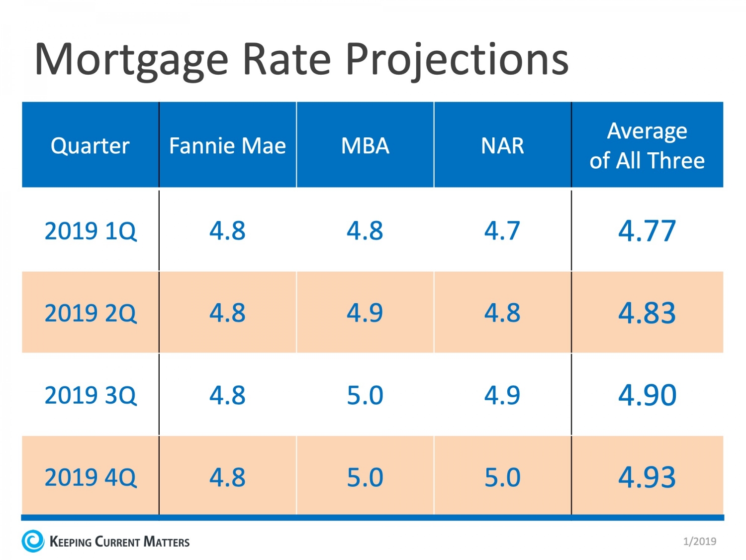 According to the latest forecasts from Fannie Mae, the Mortgage Bankers Association, and the National Association of Realtors, mortgage rates will increase over the course of 2019, but not at the same pace they did in 2018. You can see the forecasts broken down by quarter below.